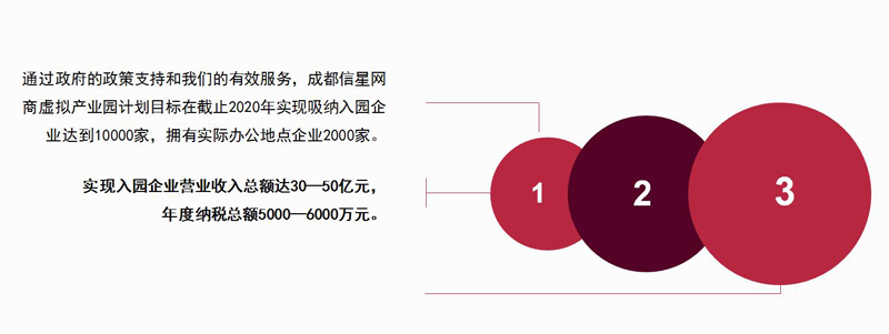 成都信星虚拟产业园发展规划预计2020年入园地址托管企业达到2万家,并为入园企业提供工商注册,公司注册,代理记账等服务超过10万次。