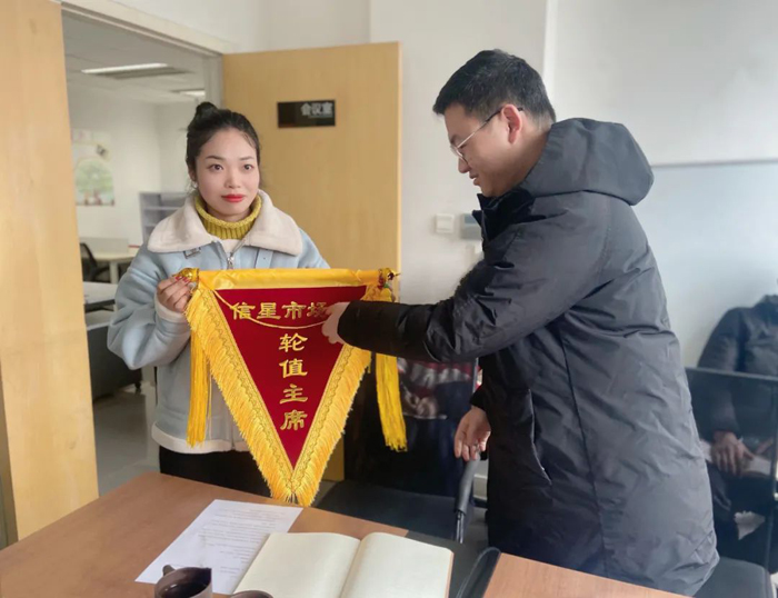 园区试行市场部轮值主席制度,首届轮值主席由杨小梅担任,并在现场进行就职授旗仪式。