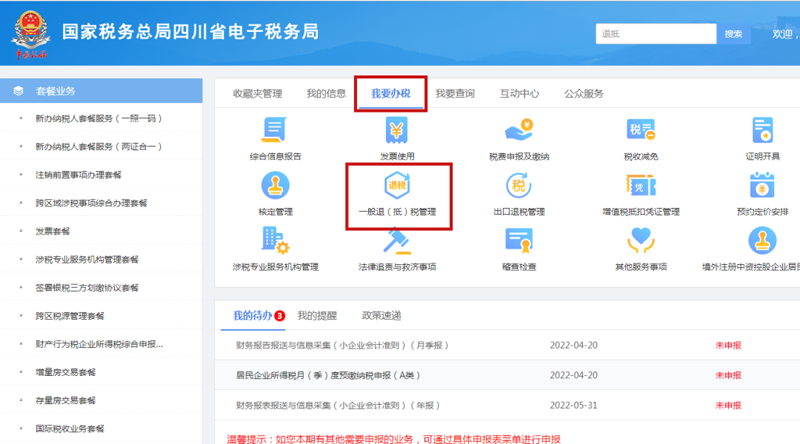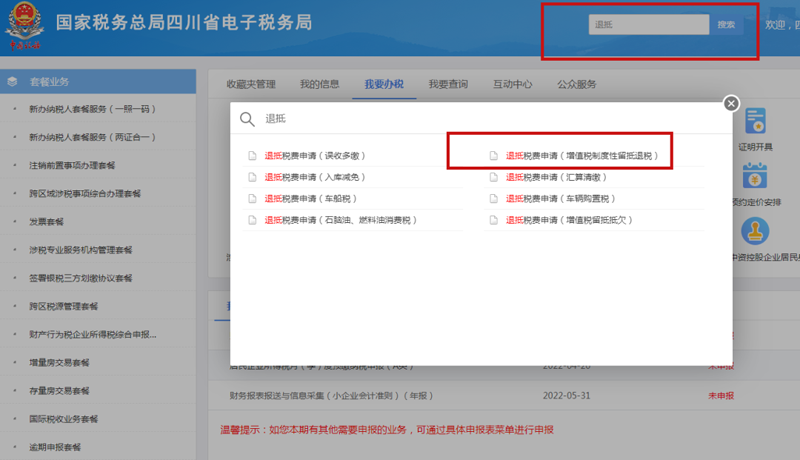 2)直接进入,在电子税务局首页搜索“退抵税”,点击退抵税费申请(增值税制度性留抵退税)或在电子税务局首页点击我要办税--一般退抵税管理--退抵税费申请(增值税制度性留抵退税)