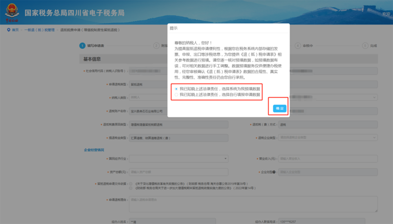 选择是否需要系统需要预填数据后,点击确认