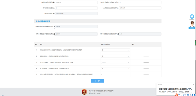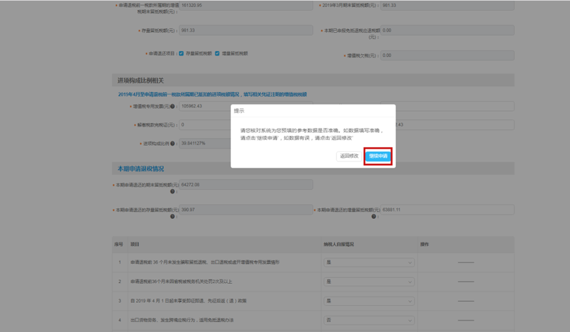 点击下一步,系统提示核对系统为您预填的参考数据是否准确,核对无误点击继续申请