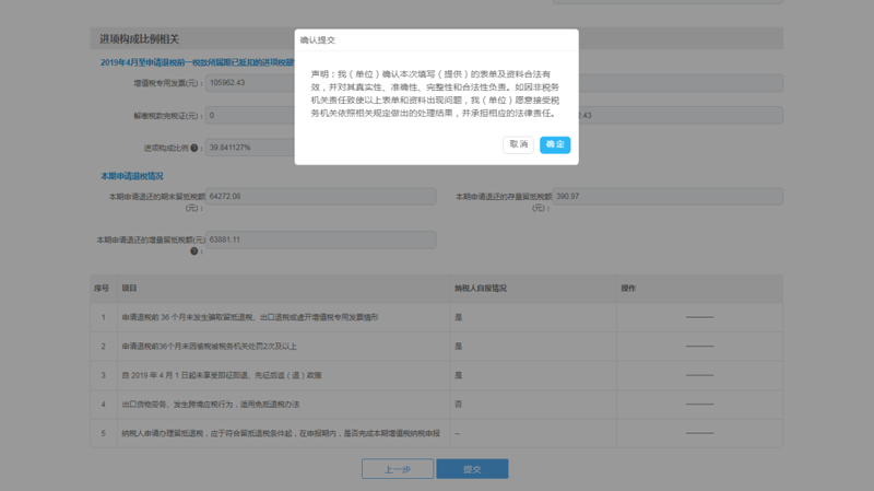 2)系统提示纳税人对表单及资料合法有效,并对其真实性、准确性、完整性和合法性负责。点击确认